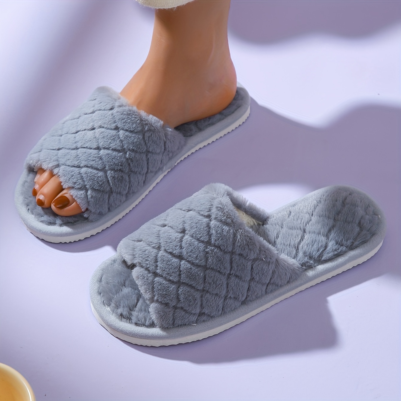 Cozy Plush Slippers - Soft Fabric Inner, Slip-Resistant EVA Sole, Plaid Pattern, Open-Toe Design, Non-Slip Flat Soft Sole, Fluffy Slides for Indoor Warmth and Comfort - Perfect for Cold Winter Days