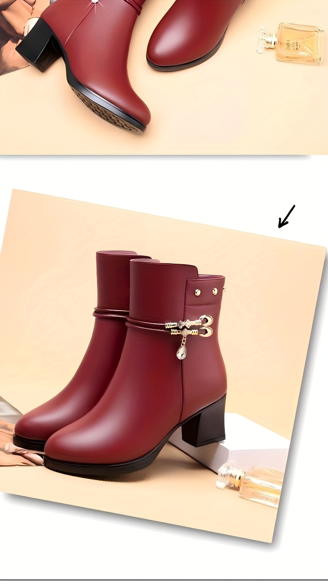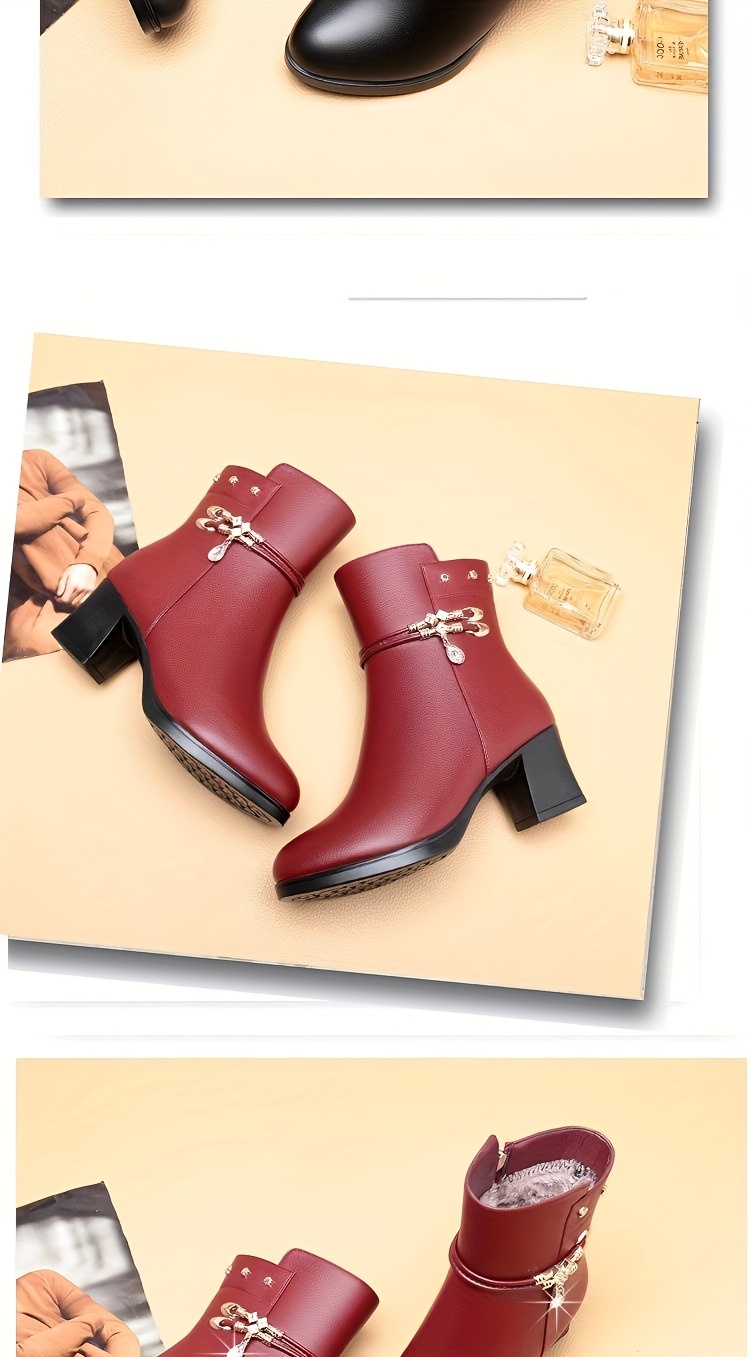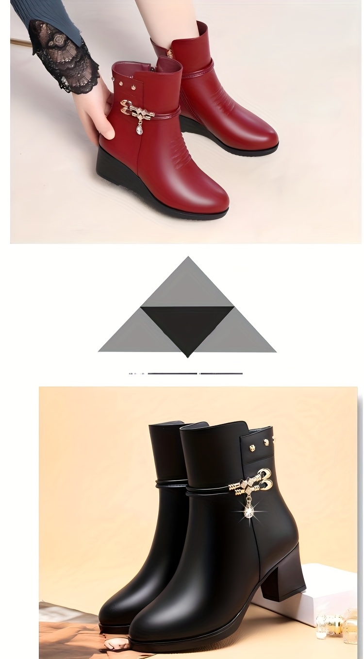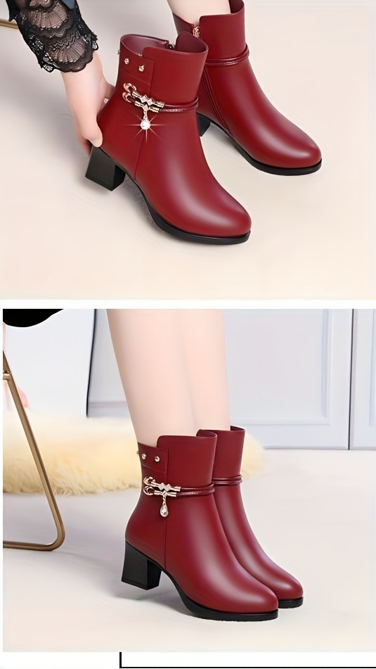 Women'S Large Size Fleece-Lined Mid-Calf Boots with Thick Low Heel & Zipper Closure - Round Toe PU Cover Winter Boots with Plush Lining, Warm & Stylish for Casual & Semi-Formal Outfits, Durable Rubber Sole (Red/) - Easy On/Of