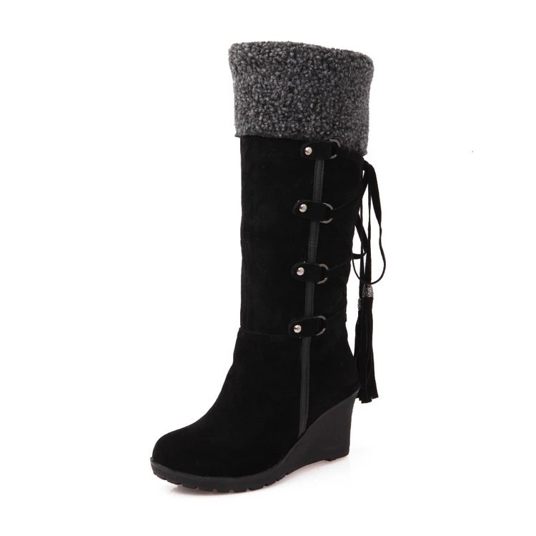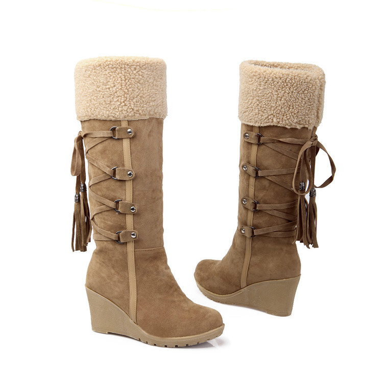 Women's Suede-Style Shearling-Lined Knee-High Winter Boots with Fringe & Tassel Laces - Plush Corduroy-like Sole, Korean/ Inspired Snow Shoes (Black/Beige/Brown) - Upper for Cold Weather, Korean Fashion Footwear